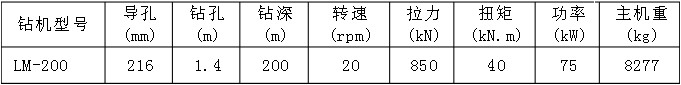(4)鉆具 鉆具包括φ216mm導(dǎo)孔鉆頭、φ1.4m擴孔鉆頭、φ2.0m擴孔鉆頭(因為φ2.0m擴孔鉆頭比φ1.4m鉆頭一邊只大30cm,且鉆頭較重、鉆進速度較慢,所以一般不采用。)、鉆桿(開孔鉆桿、穩(wěn)定鉆桿和普通鉆桿)等。在斜井施工中,為減少阻力,使用φ1.4m擴孔鉆頭更為有效。 3.3 施工技術(shù)參數(shù) (1)我局豎井、斜井施工設(shè)備選取的反井鉆機機型為LM-200型。詳細(xì)參數(shù)見表3-1、表3-2。