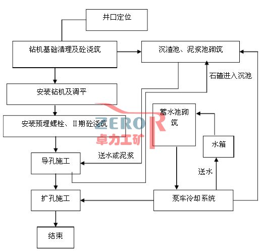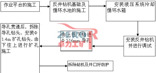 作業(yè)平臺(tái)的施工 反井鉆機(jī)基礎(chǔ)及循環(huán)水池的施工 安裝液壓系統(tǒng)冷卻循環(huán)水箱 安裝反井鉆機(jī)并進(jìn)行調(diào)試 由上往下鉆進(jìn)Φ216mm導(dǎo)孔 導(dǎo)孔貫通后,拆除導(dǎo)孔鉆頭,安裝Φ1.4m擴(kuò)孔鉆頭,由下往上進(jìn)行擴(kuò)孔施工 拆除鉆機(jī)及井口好防護(hù)