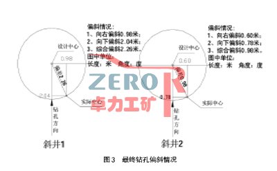 在完成的兩條斜井中,第一條最終實際透孔位置較設(shè)計透孔中心向下偏斜2.O4m,向右偏斜0.98m,綜合偏斜2.26m,鉆孔長度212.62m,綜合偏斜率1.06%;第二條最終實際透孔位置較設(shè)計透孔透孔中心向下偏斜O(jiān).78m,向右偏斜O(jiān).6Om,綜合偏斜0.98m,鉆孔長度212.76m,綜合偏斜率0.46%.兩條斜并在鉆孔較深、巖層較硬的條件下,偏斜度的控制均取得了良好的效果。透孔具體情況見圖3。