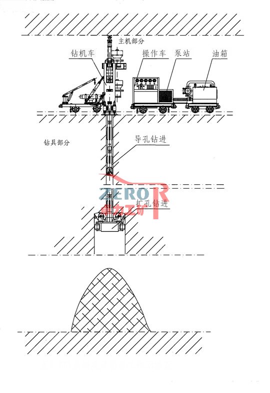 • 鉆機(jī)采用向下鉆導(dǎo)向孔、向上擴(kuò)孔、全斷面切割、直接成井的鉆進(jìn)方式,天井能直接鉆通,擴(kuò)孔刀頭從上水平取出;
