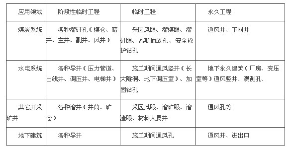 反井鉆機(jī)施工(也稱天井鉆機(jī))施工主要用于地下井筒建設(shè)中。反井鉆機(jī)應(yīng)用范圍見下表: